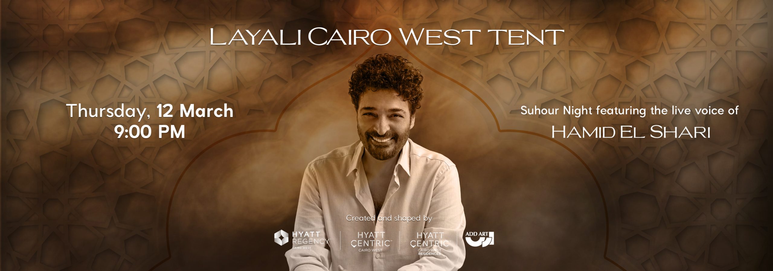 Enjoy a nostalgic Sohour experience at Layali Cairo West Ramadan Tent, featuring a live performance by Hamid El Shari, the voice behind timeless hits that shaped generations. Throughout the evening, relive the golden memories with special activations, curated giveaways, premium Sohour catered by Hyatt Regency Cairo West, and authentic Takht Sharqi performances before the legend takes the stage.