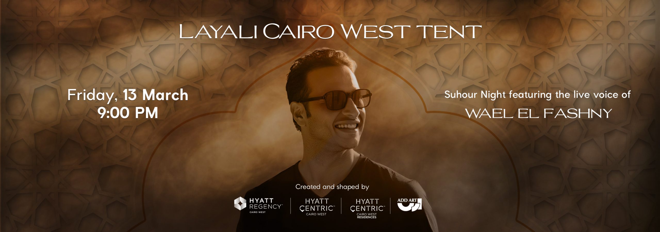 Immerse yourself in a spiritual Sohour experience at Layali Cairo West Ramadan Tent, featuring a live performance by Wael El Fashni, whose voice has become deeply connected to the soul of Ramadan. The night unfolds with meaningful activations, exclusive experiences, premium Sohour catered by Hyatt Regency Cairo West, and traditional Takht Sharqi performances setting the tone before the main performance.