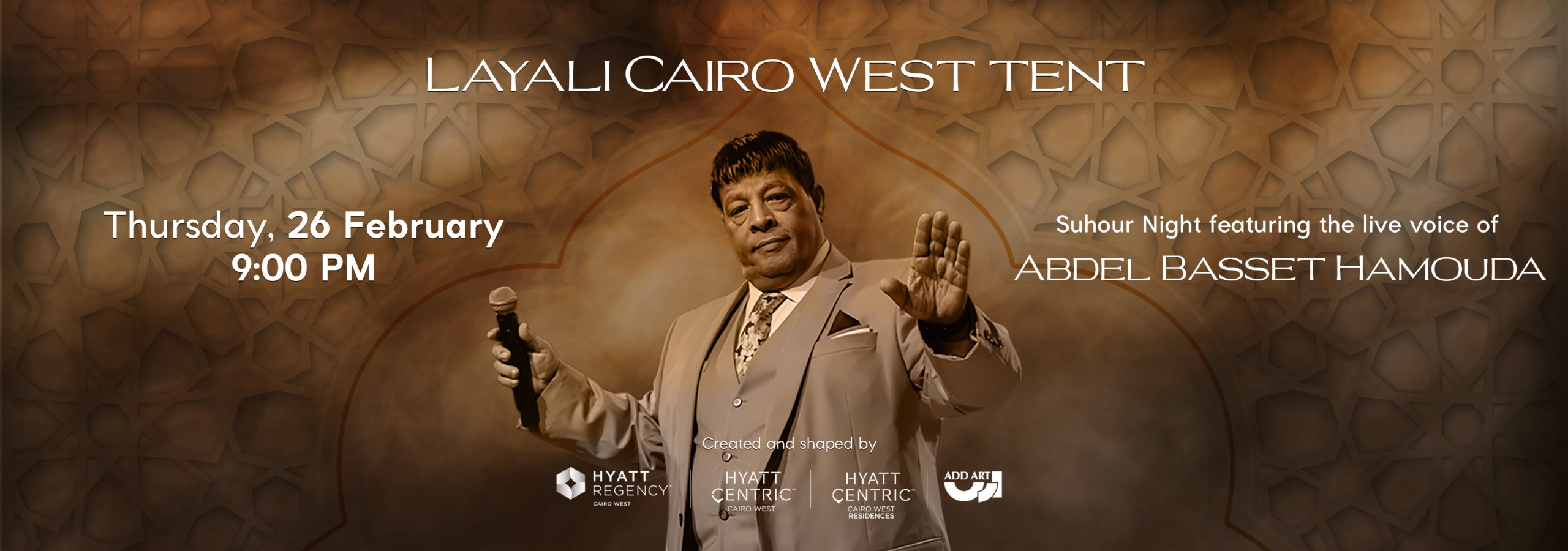 Enjoy a vibrant Sohour experience at Layali Cairo West Ramadan Tent on 26 February, featuring a live performance by Abdel Basset Hamouda. Throughout the night, explore special activations you won’t want to miss, from Qalam activation with custom-made giveaways, to premium Sohour catering by Hyatt Regency Cairo West, plus authentic Takht Sharqi performances before the star takes the stage.